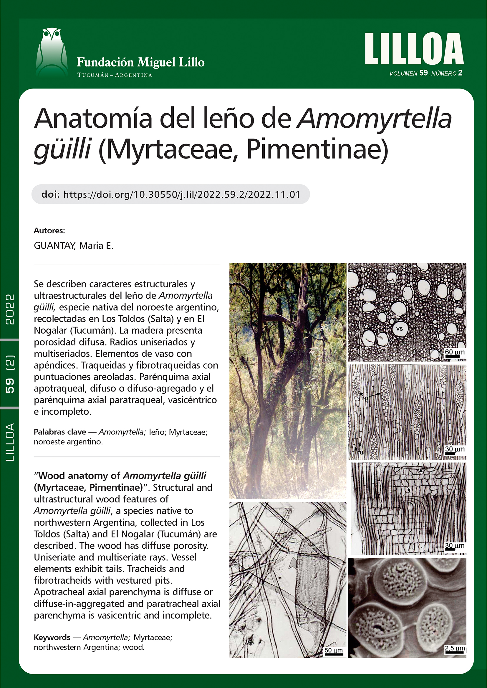 Se describen los caracteres estructurales y ultraestructurales del leño de Amomyrtella güilli, especie monotípica nativa del noroeste argentino perteneciente a la subtribu Pimentinae. Se analizaron muestras recolectadas en las localidades de Los Toldos (Provincia de Salta) y de El Nogalar (Provincia de Tucumán); ambas pertenecientes a las Yungas. La madera se caracteriza por presentar porosidad difusa, con vasos principalmente solitarios. Radios uniseriados y multiseriados de 2-7 células de ancho. Elementos de vaso con apéndices, placa de perforación simple y puntuaciones areoladas. Traqueidas y fibrotraqueidas con puntuaciones areoladas. Parénquima axial apotraqueal difuso o difuso-agregado y parénquima axial paratraqueal  vasicéntrico e incompleto. Este trabajo permitió describir elementos anatómicos del leño de A.güilli de valor sistemático al momento de diferenciar taxones de la misma subtribu.