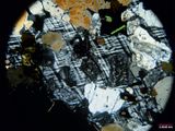 | Microclino | fenocristal de microclino, anhedral, sin alteración y con maclas en enrejado que presenta inclusiones de cristales subhedrales de plagioclasa con alteraciones a sericita y caolinita. Algunos cristales incluidos también presentan mirmequitas.También hay inclusiones de cuarzo, anhedral y con extinción normal y láminas de biotita, subhedrales. |