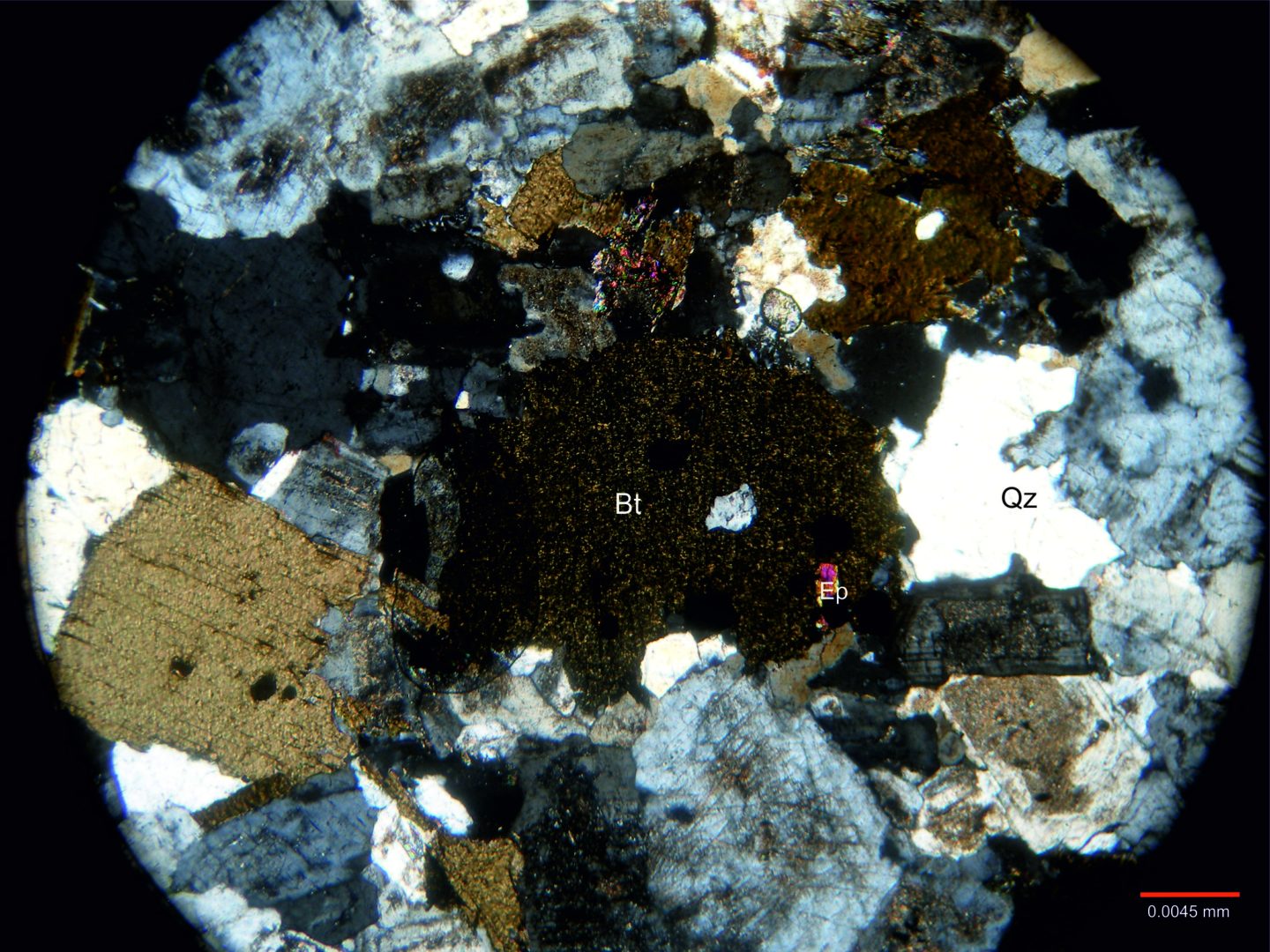 Corte La Angostura: Tonalita de dos micas. Fotomicrografía de Biotita con epidoto, La Angostura (con nicoles).